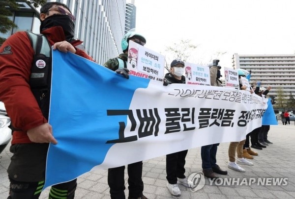 ▲ 2일 오전 서울 쿠팡 본사 앞에서 라이더유니온 관계자 등이 라이더 안전·생존권 보장 집회를 하고있다. (사진=연합뉴스) |