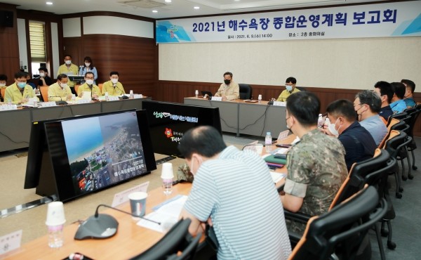 군은 빈틈없는 관광객 맞이를 위해 지난 9일 군청 중회의실에서 가세로 태안군수를 비롯한 각 기관, 단체 관계자 등 50여 명이 모인 가운데 ‘2021년 해수욕장 종합 운영계획’ 보고회를 가졌다.