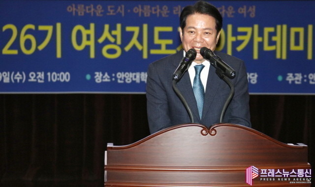 | ▲최대호 안양시장이 19일 오전 10시 안양대학교 아름다운리더관 소강당에서 열린 제26기 안양시 여성지도자 아카데미’ 입학식에서 인사말을 하고 있다.(사진=안양시) |