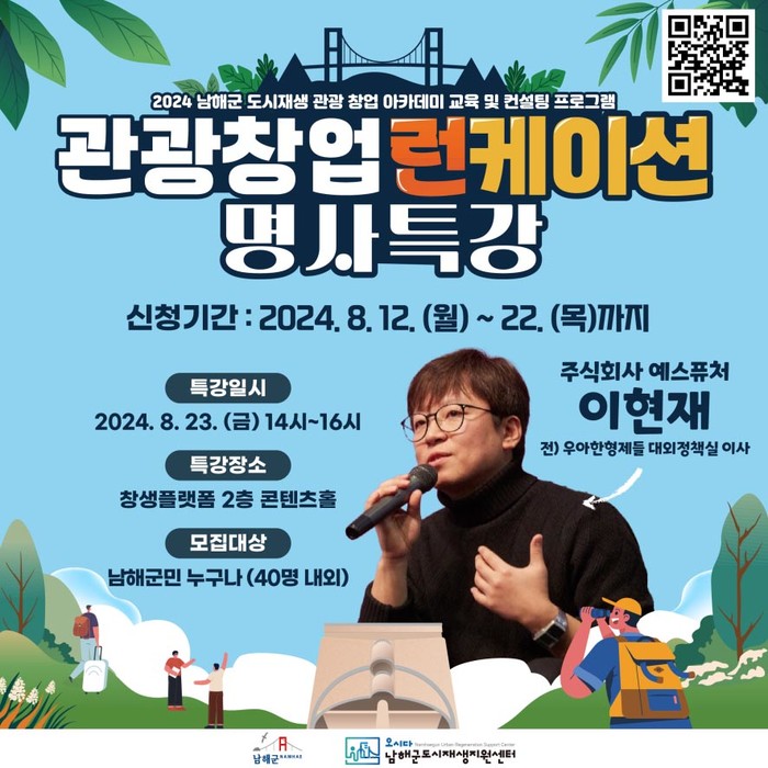 이번 명사특강은 지역 관광산업의 성장 및 창업 활성화를 위해 추진 중인 ‘남해군 도시재생 관광창업아카데미 교육 및 컨설팅’ 프로그램의 일환으로 추진된다. 교육생뿐만 아니라 남해군민이라면 누구나 사전 신청을 통해 강의를 들을 수 있다.