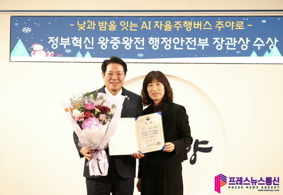 [프레스뉴스] 장현준 기자= 안양시가 행정안전부 주관 ‘2025년 정부혁신 왕중왕전’ 민원서비스 혁신 분야에서 ‘낮과 밤을 잇는 인공지능 자율주행버스 주야로’ 혁신사례로 행정안전부장관상을 수상했다.