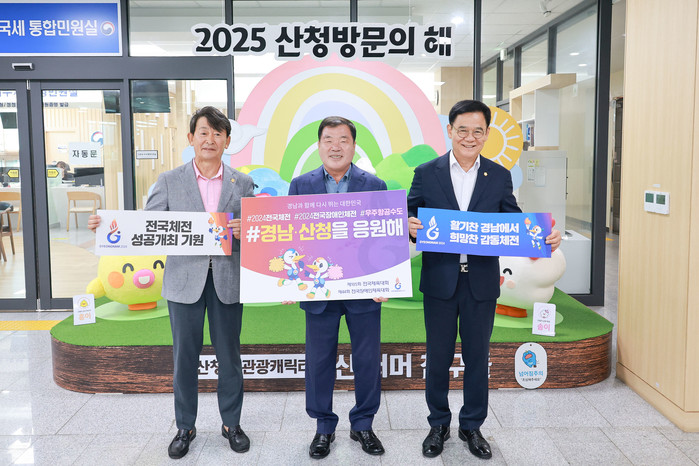 이승화 군수는 김수한 산청군의회 의장, 권희성 산청군체육회장과 함께 경남에서 열리는 양대 체전의 성공을 기원하고 도민과 군민의 관심을 요청했다.
