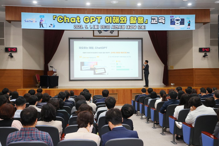 | ▲ 사천시가 5월 정례조회에서 전 직원을 대상으로 Chat GPT 특강를 하고 있다.(사진=사천시) |