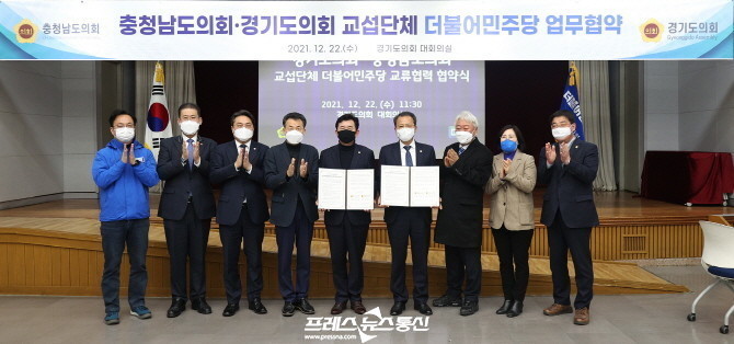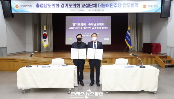 [프레스뉴스] 김대일 기자= 경기도의회 교섭단체 더불어민주당(대표의원 박근철, 의왕1)은 충청남도의회 교섭단체 더불어민주당(원내대표 이계양, 비례)과 22일(수) 경기도의회 대회의실에서「경기도의회-충청남도의회 교섭단체 더불어민주당 교류·협력 협약식」을 개최했다.