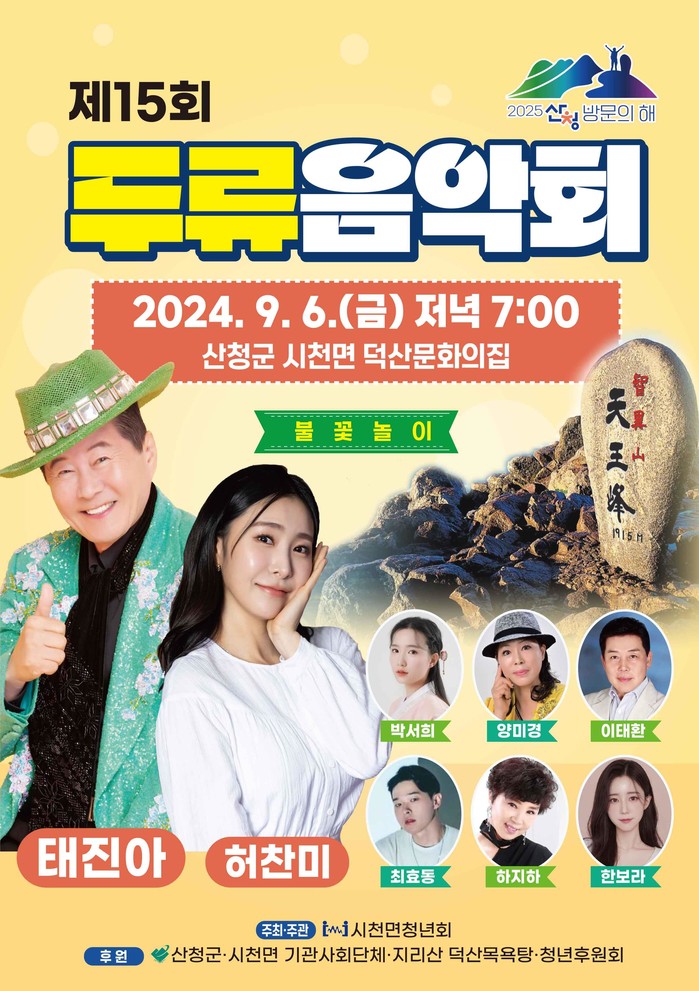 시천면청년회가 주관하는 올해 음악회는 지역 전문 MC 손병국의 사회로 태진아, 허찬미, 한보라, 하지하, 양미경, 박서희, 최효동, 이태환 등의 신명나고 열정적인 무대와 형형색색의 화려한 불꽃놀이가 펼쳐진다.