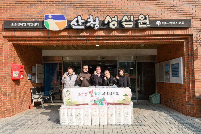| ▲산청군은 설 명절 맞아 장애인·노인생활시설 14곳에 900만원 상당 위문품을 전달했다. (사진=산청군) |