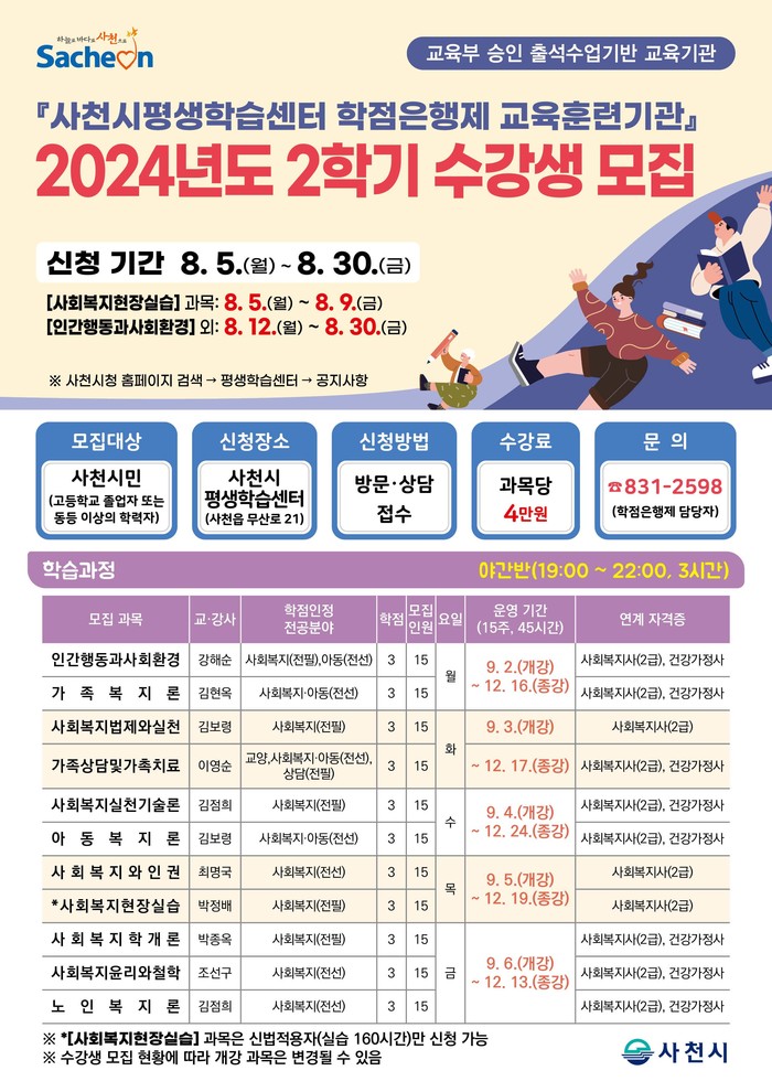 사천시, 2024년 2학기 학점은행제 학습과정 수강생 모집