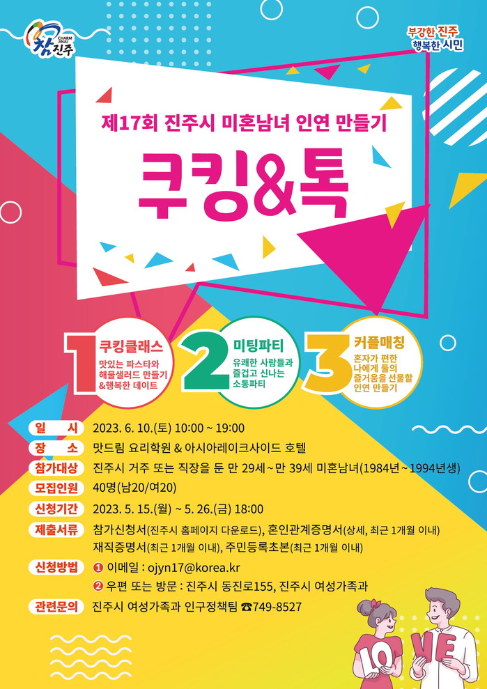 진주에 주소를 두고 있거나 직장을 둔 1984년생 ~ 1994년생 미혼남녀는 누구나 신청 가능하다. 참가 신청은 진주시 홈페이지에서 신청서를 다운받아 진주시 여성가족과로 이메일로 접수하거나, 방문 또는 우편으로 5월 26일까지 접수하면 된다.