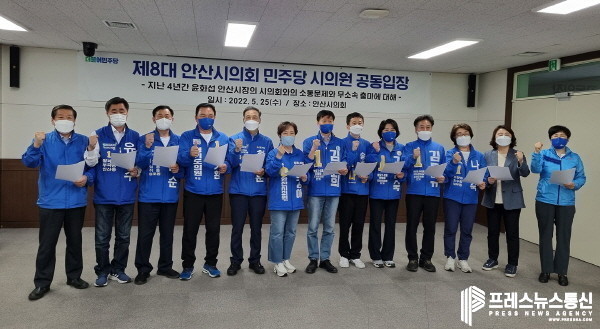 [프레스뉴스] 김대일 기자= 8대 안산시의회 더불어민주당 전현직 의원 13명이 의회 대회의실에서 25일 공동 입장문을 발표하고 무소속 윤화섭 후보의 출마에 대해 ‘불통 시장이 시민후보가 웬 말이냐’며 제종길 안산시장 후보 지지 입장을 분명히 표명한다고 밝혔다.