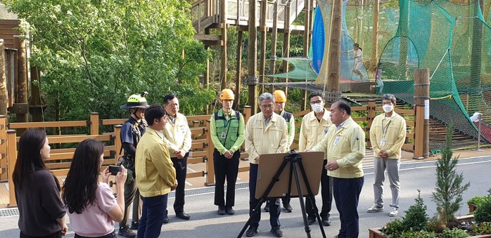 합동 점검반은 아동‧청소년과 가족단위 관람객들이 많이 이용하는 유아숲, 곡선형 짚와이어, 에코라아더 등 산림레포츠시설 위주로 안전줄, 안전벨트, 체험용 카트, 방부목, 로프(그물망) 등 시설 전반의 안전관리 실태와 위험상황 발생 시 비상행동요령을 점검했다.