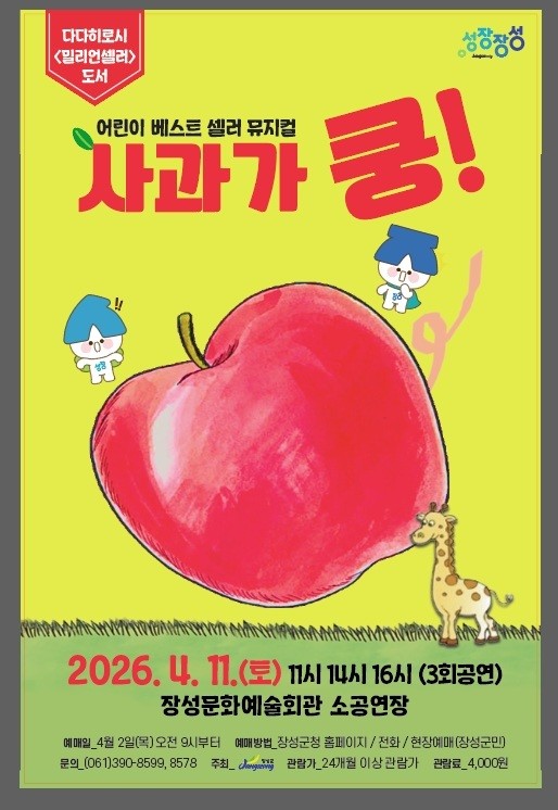 [전남=프레스뉴스] 박정철 기자=장성군이 ‘밀리언셀러’(백만 부 이상 판매 기록) 동화책 ‘사과가 쿵!’을 원작으로 한 어린이 뮤지컬을 선보인다.