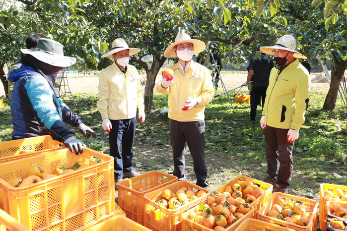 | ▲ ‘의령 농산물 기준가격 보장제’ 시행 후 첫 지원을 받는 단감 농가를 방문한 오태완 군수(사진=의령군) |