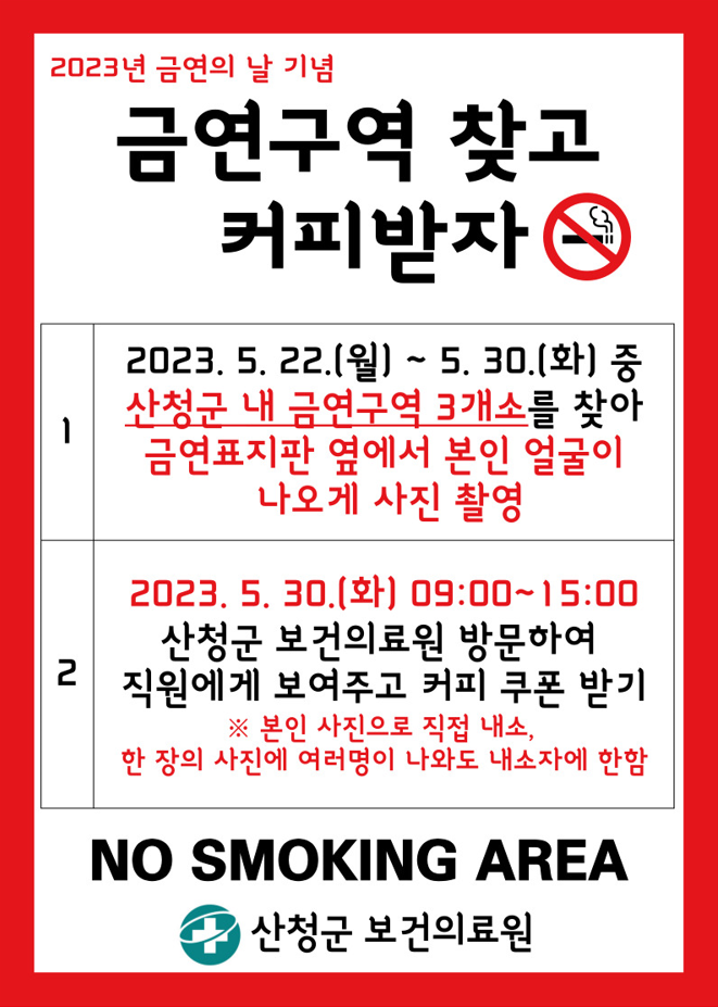또 홍보관 운영과 함께 오는 30일까지 지역 내 금연구역 3개소를 찾아 금연표지판 옆에서 본인 얼굴이 나오게 사진촬영을 하면 커피 쿠폰(선착순)을 제공한다. 쿠폰은 홍보관 운영 시 산청군보건의료원을 방문해 사진을 보여주면 제공된다.