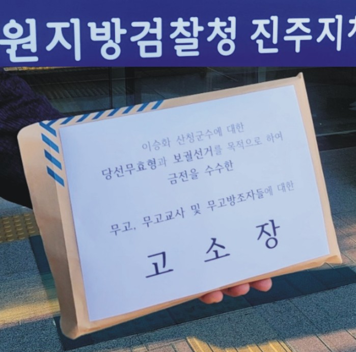 17일 이승화 산청군수 외 3명의 법률대리인인 법무법인 다승은 지난 군수선거 경쟁 후보였던 박우식 외 5명을 무고·무고교사·무고방조 혐의로 창원지방검찰청 진주지청에 고소장을 접수했다고 밝혔다.