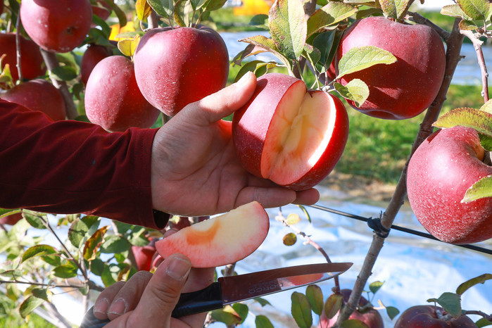 엔부사과는 껍질뿐 아니라 과육 속까지 선명한 붉은색을 띠며 맛은 당도와 산미의 조화가 뛰어나 새콤달콤한 맛이 일품이다.