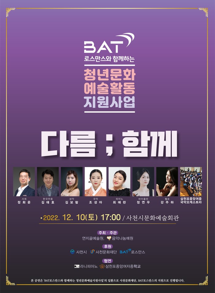 이번 공연은 BAT로스만스와 함께하는 ‘청년문화예술지원사업’에 선정돼 진행하는 것으로 사천시의 청년 예술인(만 39세 이하)들이 중심이 돼 공연을 펼친다.