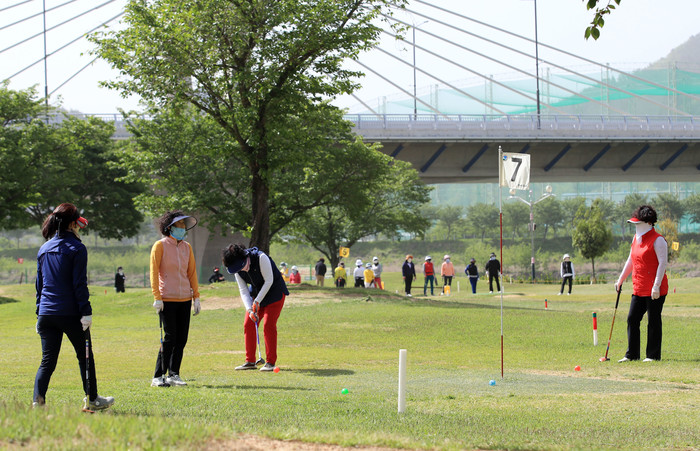 | ▲ 제5회 밀양시협회장 파크골프대회 참가자들이 경기를 펼치고 있다.(사진=밀양시) |