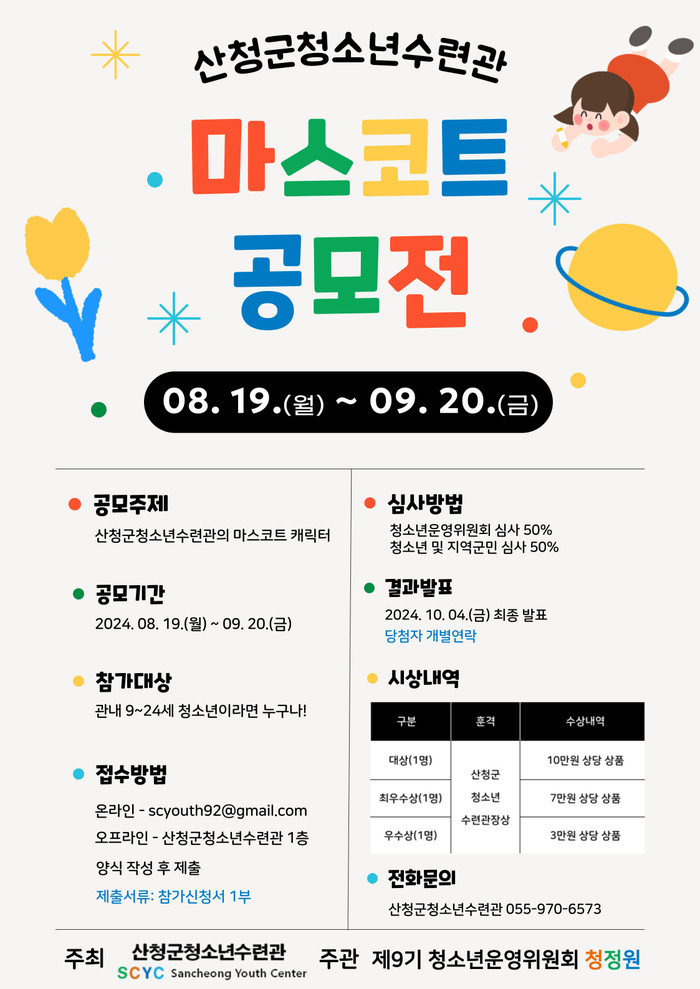 공모 결과는 10월 4일 산청군청소년수련관 SNS(인스타그램 @sancheong_youth, 네이버 밴드 band.us/band/82010626)를 통해 확인 가능하다.