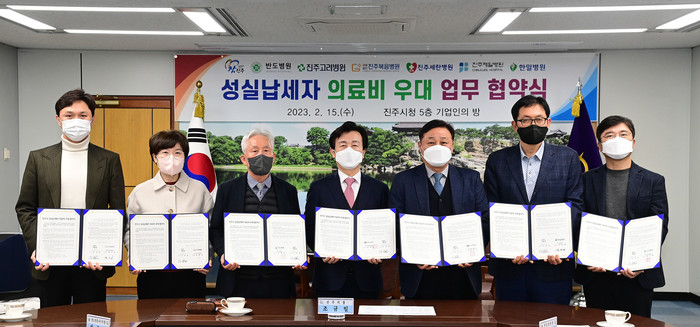 ▲ 진주시는 건전한 납세문화 정착과 성실납세자가 우대받는 분위기 조성을 위해 지방세 성실납세자에게 관내 의료기관 의료비 할인 혜택을 제공하기로 하고 관내 6개 의료기관과 업무협약을 체결했다.(사진=진주시) |