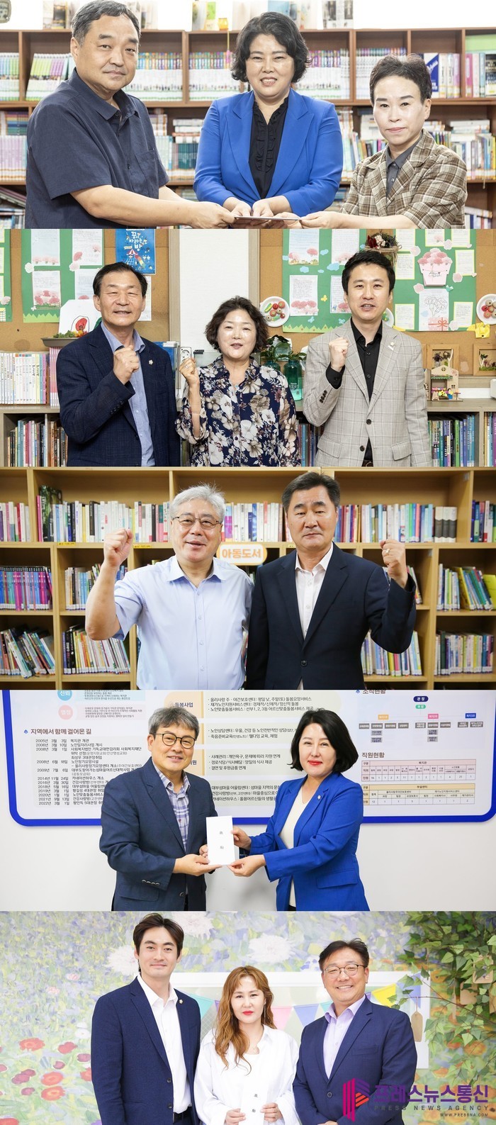 ▲위부터 차례대로 의원들이 상록수마을과 보라매 지역아동센터, 안산동믿음 지역 아동센터, 단원구 노인복지관, 대부 가치키움터를 방문한 모습.(사진= 안산시의회) |