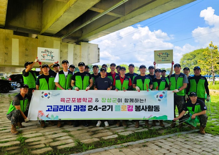 | ▲장성군 상무대 육군포병학교 부사관 교육생 25명이 최근 장성군 황룡강 일원에서 ‘플로깅’ 봉사 활동을 펼쳤다.(사진제공=장성군) |