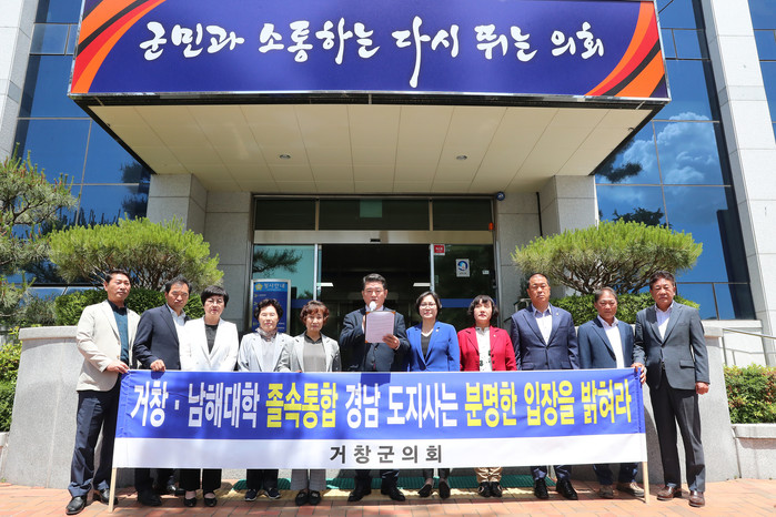 이홍희 의장을 비롯한 거창군의회 의원 전원은 이날 성명을 통해 “경상남도가 지난 12일 거창대학에서 개최한 구조개혁 사전 설명회는 거창 주민들의 우려를 종식시키기에 한참 부족했다”며 “경상남도에서 의뢰한 연구용역을 보면 ‘도립대 통합’이나 ‘캠퍼스 유휴공간 이용 방안’이라는 내용이 포함돼 있어 통합을 전제로 추진한다고 밖에 볼 수 없다”고 강조했다.