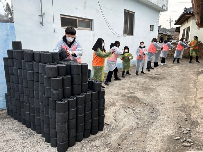 | ▲ 밀양시가족센터 봉사단원들이 연탄을 나르고 있는 모습(사진=밀양시) |