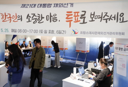 ▲제21대 대통령선거 재외국민 투표 첫날인 20일(현지시간) 프랑스 파리 16구 주프랑스한국대사관 영사부에 설치된 투표소에서 유권자들이 소중한 한 표를 행사하고 있다. (사진= 뉴스1) |