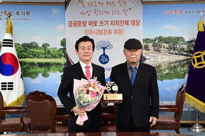 우리글진흥원의 공공문장 바로쓰기 상은 바르고 쉬운 공공문장을 일선 행정에 구현해 모범을 보인 자치단체에 수여되는 상이다. 진주시는 각종 안내문 등을 알기 쉽고 정확한 글로 선보이고, 공직자 국어능력 향상에 애쓰면서 공공문장 바로쓰기의 중요성을 환기시켰다는 평가를 받았다. 또한 문화도시로서 시정 가치와 부합하는 시정을 추진한 공적을 인정받아 이번에 수상자로 선정됐다.