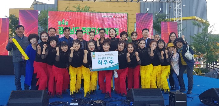 | ▲ 경남도 주민자치 박람회 우수동아리 경연 대회에서 최우수상을 수상한 화정면 라인댄스 동아리(사진=의령군) |