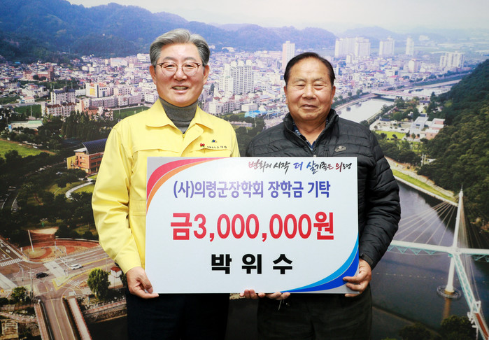 | ▲ 의령군 박위수(77) 씨가 지난 9일 의령군청을 방문해 의령군장학회에 300만 원을 기탁했다.(사진=의령군) |