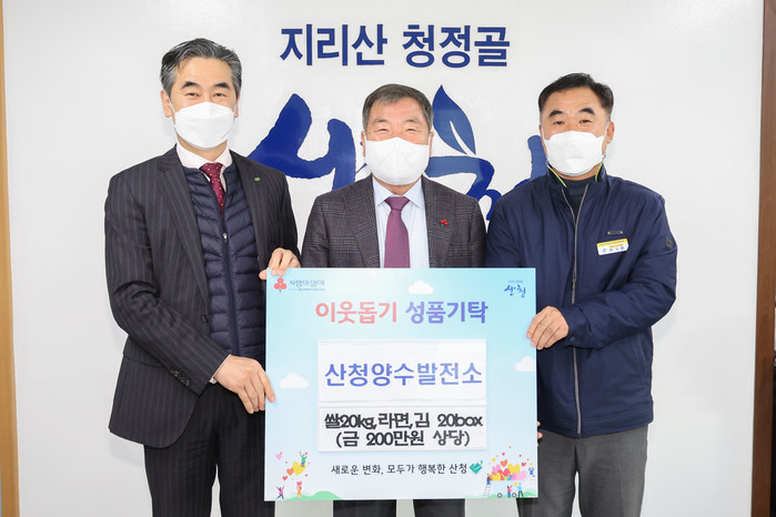 | ▲ 한국수력원자력(주) 산청양수발전소가 산청군에 이웃돕기 성품(200만 원 상당)을 기탁했다.(사진=산청군) |