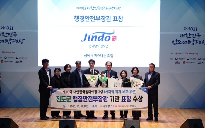 [진도=프레스뉴스] 신상균 기자= 진도군은 28일, 경찰청과 중앙일보, 제이티비씨(JTBC)가 주관한 ‘제10회 대한민국 범죄예방대상’ 시상식에서 사회적 약자 보호 부문 ‘행정안전부 장관상’을 수상했다고 밝혔다.