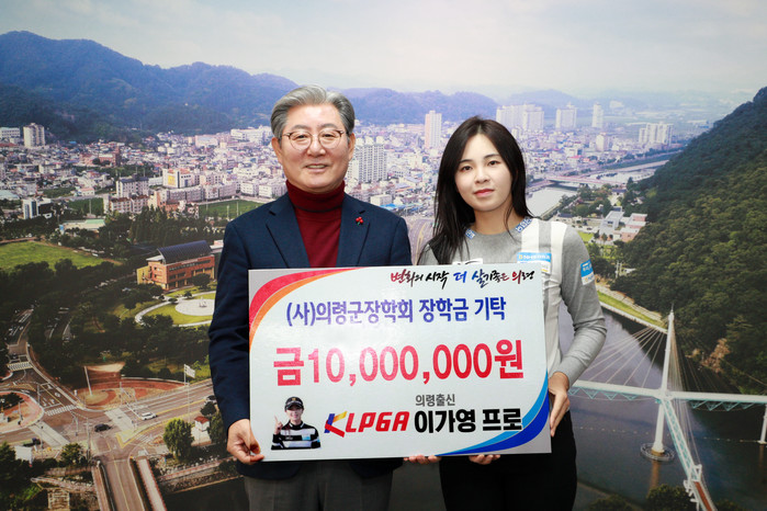 | ▲ 사단법인 의령군장학회에 인재육성 장학금 1,000만 원을 전달한 KLPGA 이가영 선수(사진=의령군) |