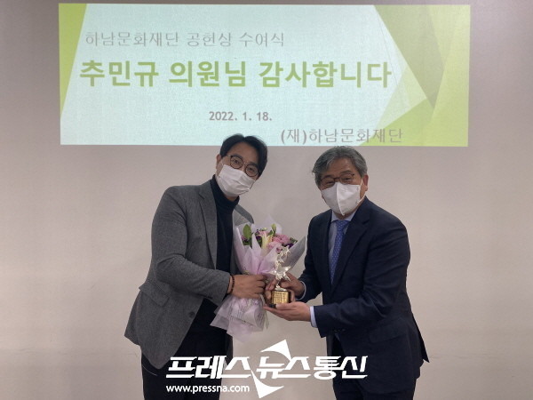 [프레스뉴스] 김대일 기자= 경기도의회 건설교통위원회 추민규 의원(더불어민주당·하남2)은 하남문화재단 서강석 대표이사로부터 문화예술회관 예산확보에 따른 공헌상을 수상했다고 18일 밝혔다.