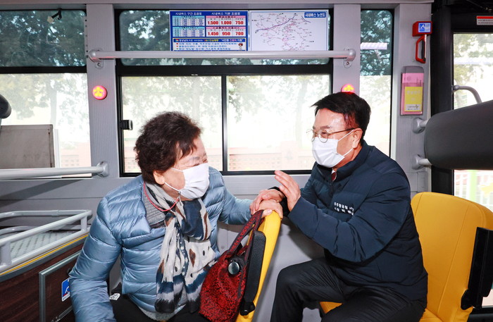 ▲ 박동식 사천시장이 시내버스 탑승객과의 대화를 통해 운행 시간, 배차간격, 노선추가 등 실질적으로 필요한 개선사항을 점검하고 있다.(사진=사천시) |