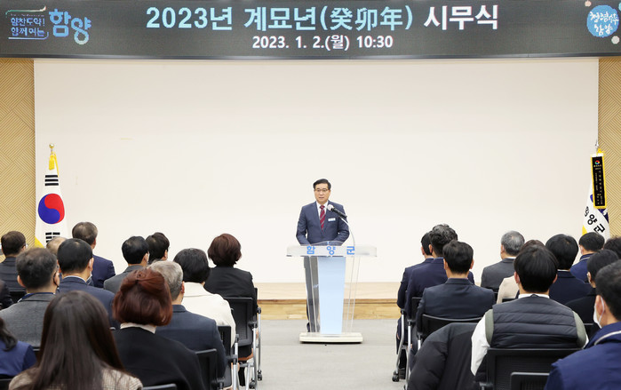 [프레스뉴스] 정재훈 기자= 함양군은 2일 오전 10시 30분 군청 대회의실에서 직원, 유관기관, 민간인 등 120여 명이 참석한 가운데 2023년 계묘년 시무식을 갖고 민선 8기 ‘힘찬도약 함께여는 함양’의 원년을 위한 각오를 다졌다.