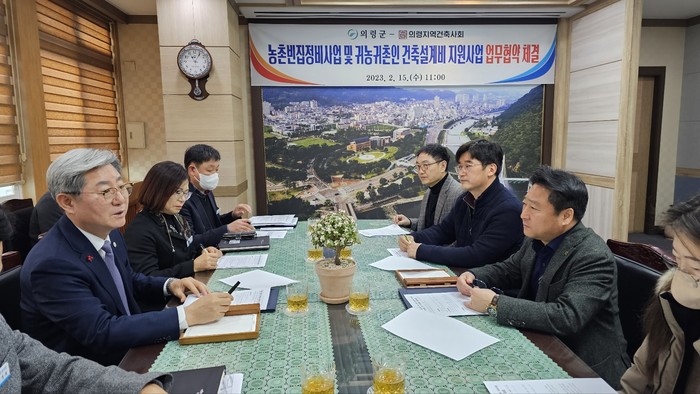 ▲ 의령군은 의령지역건축사회와 업무협약을 맺고 지역으로 귀농귀촌을 희망하는 세대가 주택을 신축하는 경우 건축설계비를 지원하고, 빈집 정비 시 해체계획서 등 서류 작성 비용을 대폭 할인하기로 했다.(사진=의령군) |