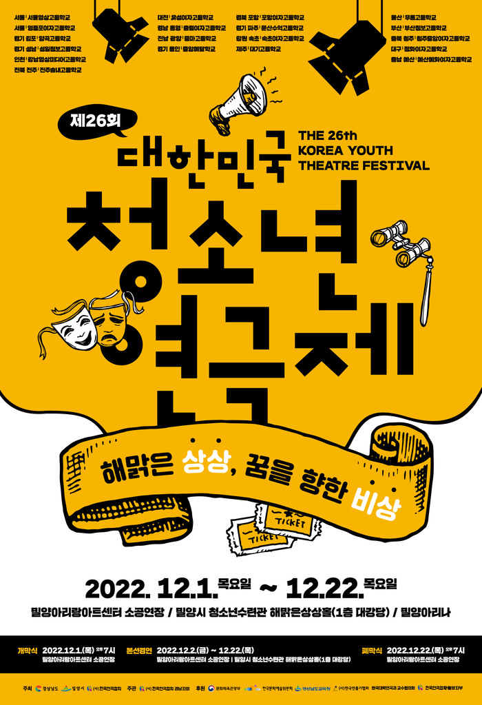 대한민국 청소년연극제는 ‘해맑은 상상, 꿈을 향한 비상’이라는 슬로건으로 12월 1일부터 12월 22일까지 밀양아리랑아트센터, 밀양시 청소년수련관, 밀양아리나 일원에서 펼쳐진다.