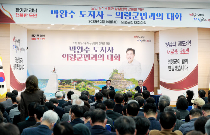[프레스뉴스] 정재훈 기자= 박완수 경상남도지사는 14일 오후 의령군청을 방문해 250여 명의 군민들과 대화의 시간을 가졌다.