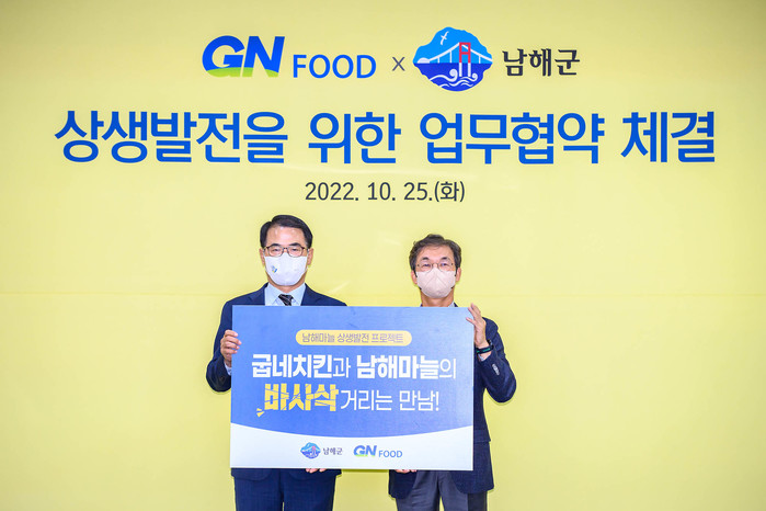 지앤푸드는 남해마늘을 활용한 치킨을 개발·판매해 남해마늘의 대외적 인지도 향상에 기여하고, 남해군은 우수한 품질의 마늘을 공급함으로써 ‘보물섬이 키운 남해마늘’ 브랜드 파워를 더욱 향상시킬 것으로 기대된다.
