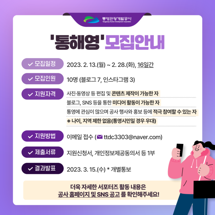 지원방법은 통영관광개발공사 홈페이지 공지사항 또는 공식 블로그에 첨부된 지원서를 작성하여 이메일로 제출하면 되고, 최종 선정 결과는 3월 15일(수) 합격자에게 개별 통보할 예정이다.