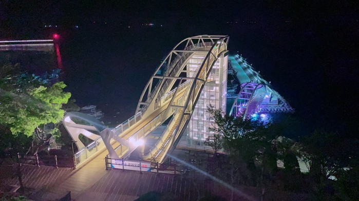 이번에 설치된 수직 엘리베이터와 스카이브릿지는 수려한 경관의 사천바다로 힘차게 뛰어 들어가는 토종 돌고래 ‘상괭이’의 모습을 표현한 것으로 생동감이 넘친다. 그리고 야간경관 조명설치로 사천 앞바다의 아름다운 뷰를 조망할 수 있는 청널공원의 언덕 위 하얀 풍차와 함께 멋들어진 야경도 연출한다.