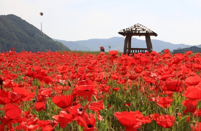 직전 들판을 붉게 수놓은 꽃양귀비 외에도 축제장 곳곳에는 유채꽃, 하얀.분홍빛 안개초, 수레국화, 유럽.아메리카 양귀비, 수국, 미니다알리아, 연꽃정원, 이색꽃밭도 조성되어 볼거리가 풍성하다.