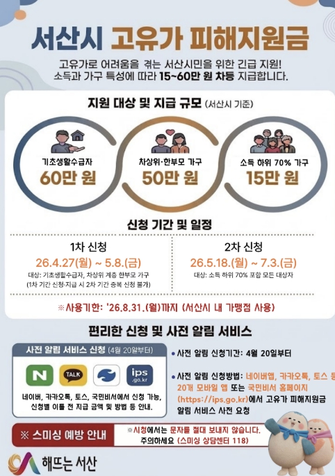 충남 서산시가 유가 상승으로 인한 시민의 부담을 줄이기 위해 ‘고유가 피해 지원금’ 지급에 행정력을 집중한다.