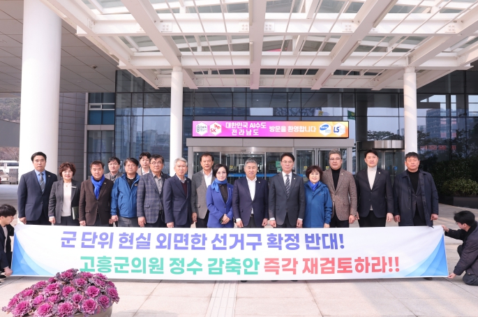 고흥군의회는 전라남도 시군의원 선거구획정위원회 제3차 회의에서 의결된 의견수렴 초안 가운데 고흥군 군의원 정수를 1명 감축하는 방안에 대해 강력히 반발하며 건의문을 발표하고, 지난 9일 전남도청을 방문해 관계 부서와 면담을 갖는 등 적극적인 대응에 나섰다.