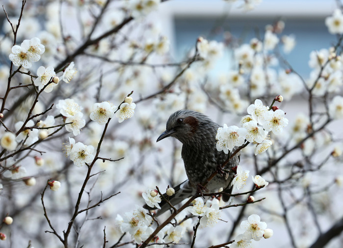 | ▲16일 오전 대전 서구 한 공원에서 직박구리가 매화꽃에서 꿀을 따고 있다./사진-뉴스1 |