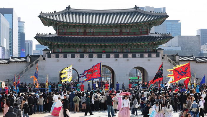 ▲화창한 날씨를 보인 8일 오후 서울 종로구 경복궁에서 시민들과 외국인 관광객들이 수문장 교대식을 관람하고 있다./사진-뉴스1 |