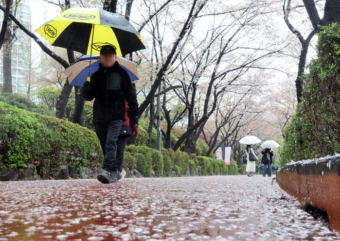| ▲ 봄비가 내린 9일 오후 서울 송파구 석촌호수를 찾은 시민들이 벚꽃잎이 떨어진 산책로를 따라 걷고 있다./사진=뉴스1 |