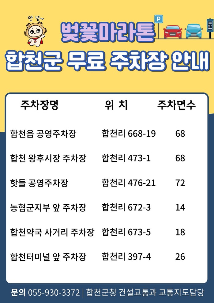 | ▲벚꽃마라톤 합천군 무료 주차장 안내 포스터(사진=합천군) |